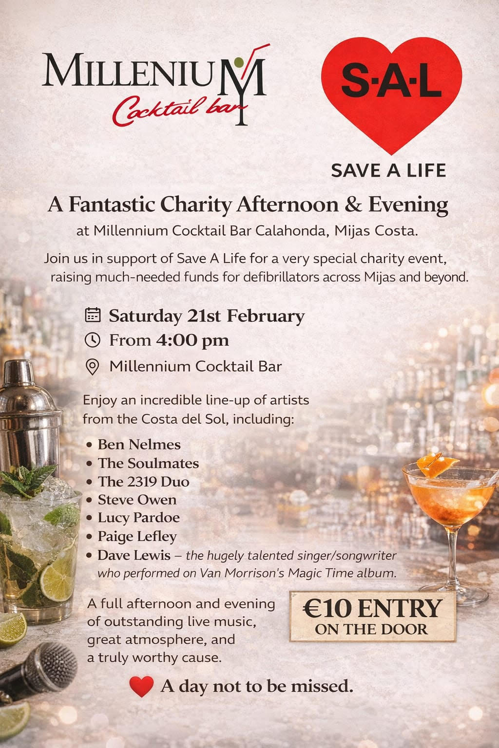 Live music and enterainment at Millenium Cocktail Bar in Calahonda, raising money for Save A Life – a local charity dedicated to installing defibrillators on the Costa Del Sol.